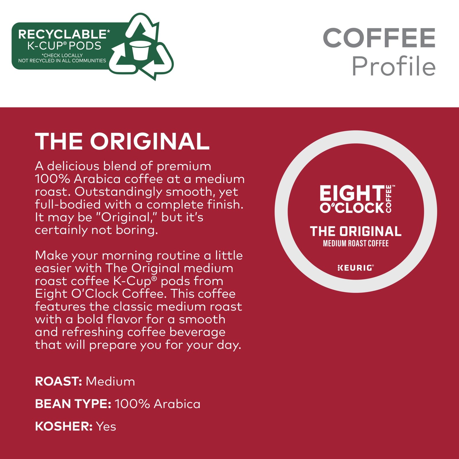 Details: Make your morning routine a little easier with the Original Medium Roast Coffee K-Cup pods from Eight O’Clock Coffee. A delicious blend of premium 100% Arabica coffee at a medium roast. Outstandingly smooth, yet full-bodied with a complex finish, this coffee may be “Original” but it’s certainly not boring. This coffee features a classic medium roast with a bold flavor for a smooth and refreshing coffee beverage that will prepare you for your day.