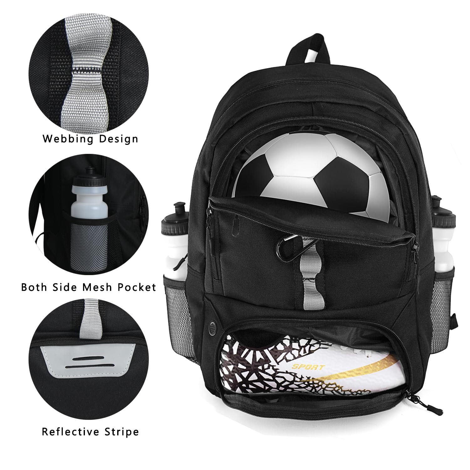 - [Strong and durable] The soccer backpack is made of durable polyester and nylon fabrics,rugged enough to withstand rain, mud, and dirt.