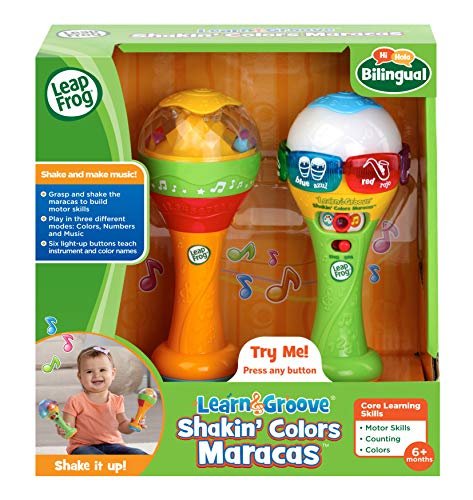 Details: Shake up learning with the Learn & Groove Shakin’ Colors Maracas! One maraca includes colorful shaker beads and the other features a light-up dome that changes colors and plays maraca sound effects. This musical toy includes three play modes that introduce colors, numbers and music. Little ones can add rattling sounds to the songs that play, count from 1-10 with every shake and press the six light-up buttons to hear color and instrument names. Switching between English and Spanish mode lets kids explore all of the content in both languages. Intended for ages 6+ months. Requires 1 AA battery. Battery included for demo purposes only, new battery recommended for regular use.
