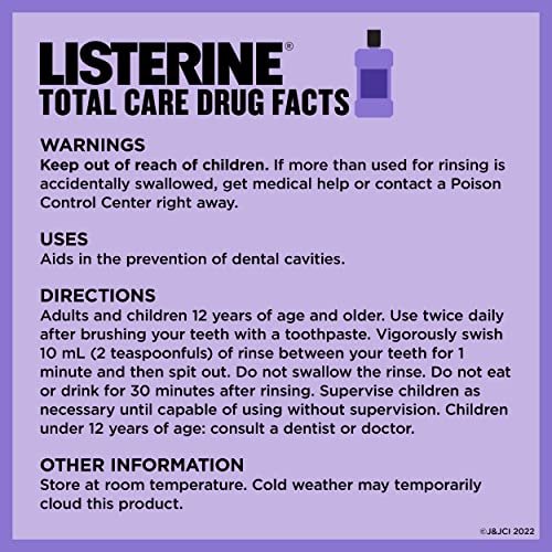 Details: Give your mouth complete care with ADA-accepted Listerine Total Care Fluoride Anticavity Mouthwash. This Fresh Mint-flavored mouthwash for bad breath provides six dental hygiene benefits in one powerful oral rinse & up to four times the fluoride uptake versus Act,* & provides 50% greater strengthening of weakened enamel vs. brushing alone in lab studies. The fluoride-rich oral rinse formula helps prevent cavities, restores enamel, & strengthens your teeth to improve oral health. Use remineralizing mouthwash to freshen breath, kill germs that cause bad breath, & clean your whole mouth. This oral rinse is accepted by the American Dental Association’s (ADA) Seal of Acceptance Program & features a fresh mint flavor that gives your mouth a clean feeling you can taste. *In laboratory tests compared to Act Total Care Anticavity Fluoride Rinse.